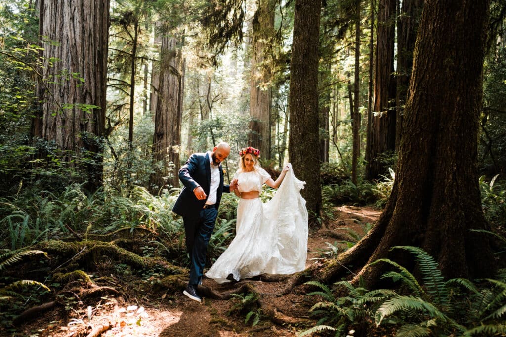 Some of the most stunning wedding day images are from gorgeous vantage points requiring a hike or at least a long walk, so steer clear of mermaid and trumpet styles. Although they are beautiful for a traditional wedding, they restrict movement quite a bit. Bending, climbing, or jumping over a small stream may not be feasible in a dress that fits your legs or hips tightly.