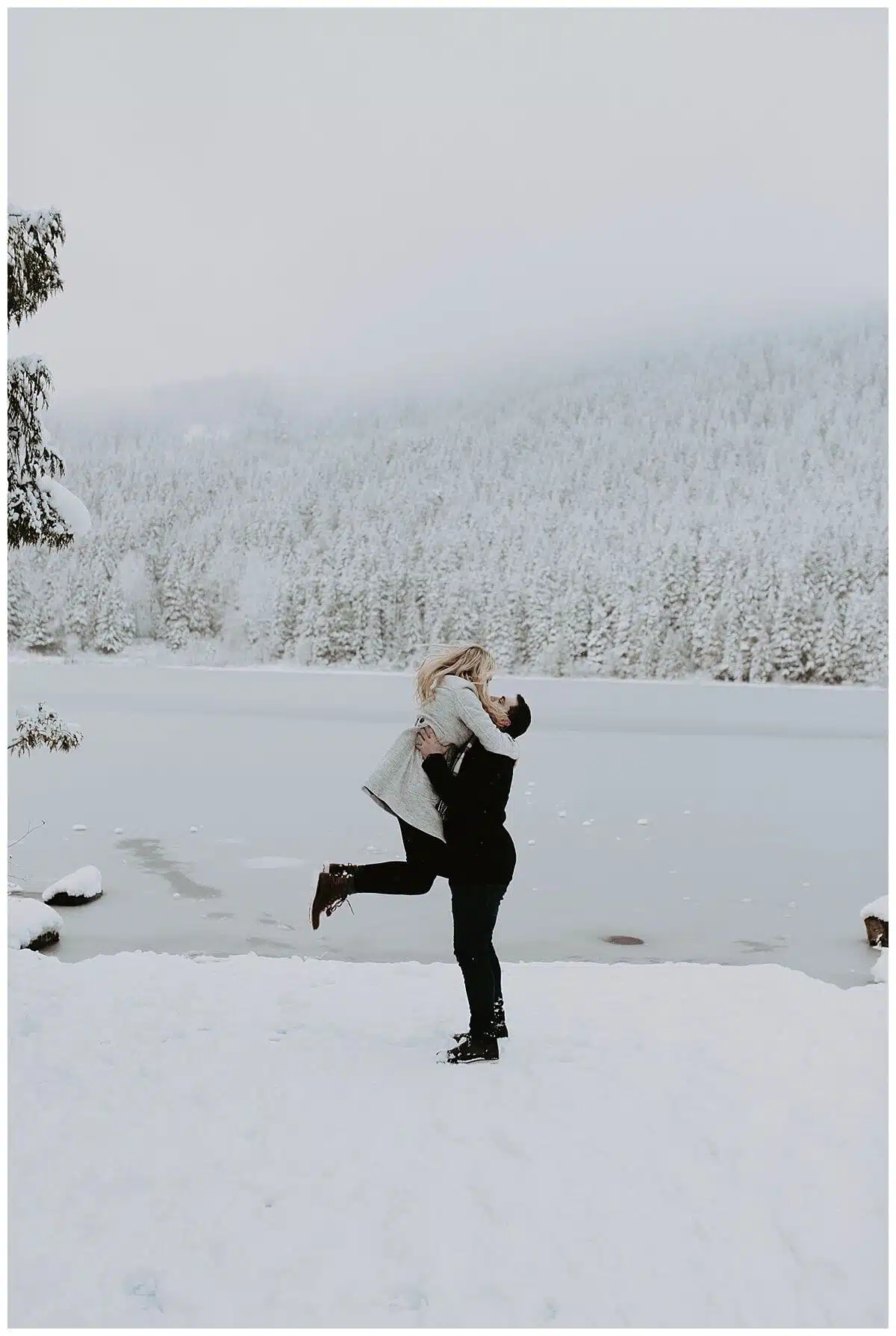 Rebecca and I had been in contact for weeks leading up to their session, trying to plan the perfect location. We initially were aiming for Timberline, but as luck would have it, it just wasn’t possible that day. I remembered Trillium Lake and said “Let’s do it!”. In the winter, Trillium Lake isn’t accessible by car, so we hiked roughly 4 miles roundtrip to get down to the lake. Let me tell you something, the combination of the lake and Rebecca and Andrew’s fun and beautiful personalities made for the perfect engagement session. I have a real hard time choosing any favorite image.