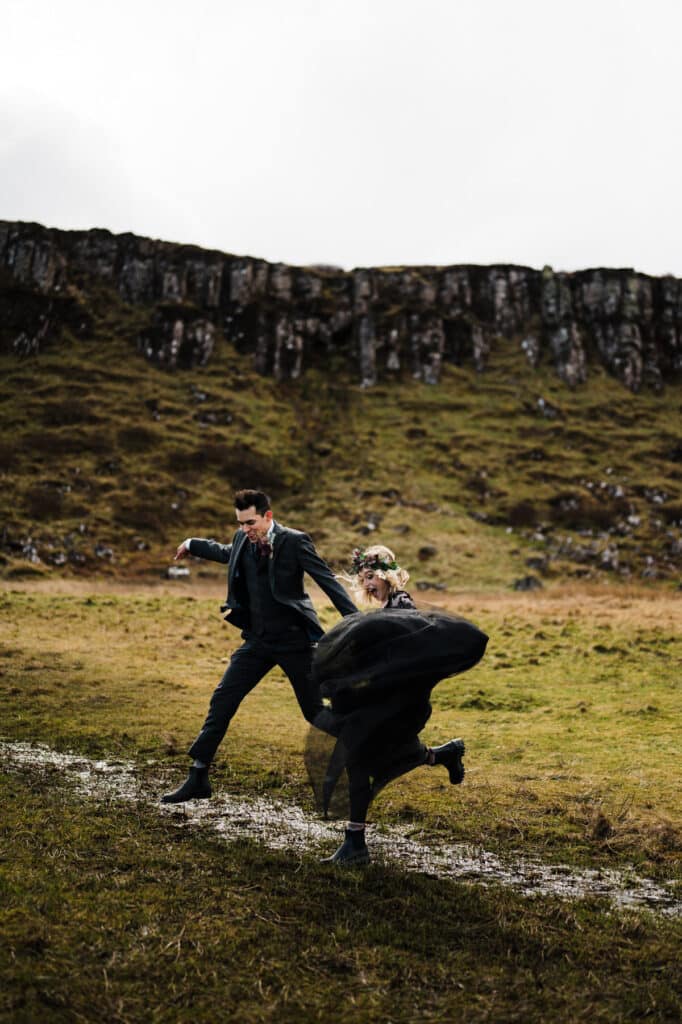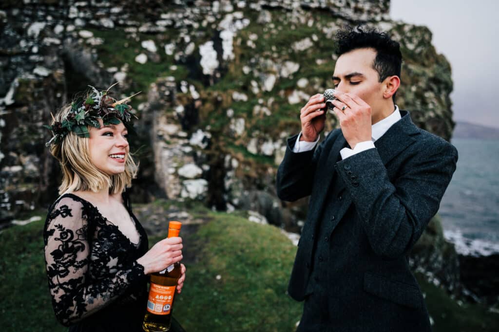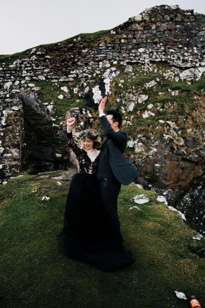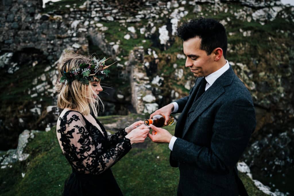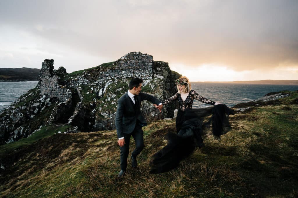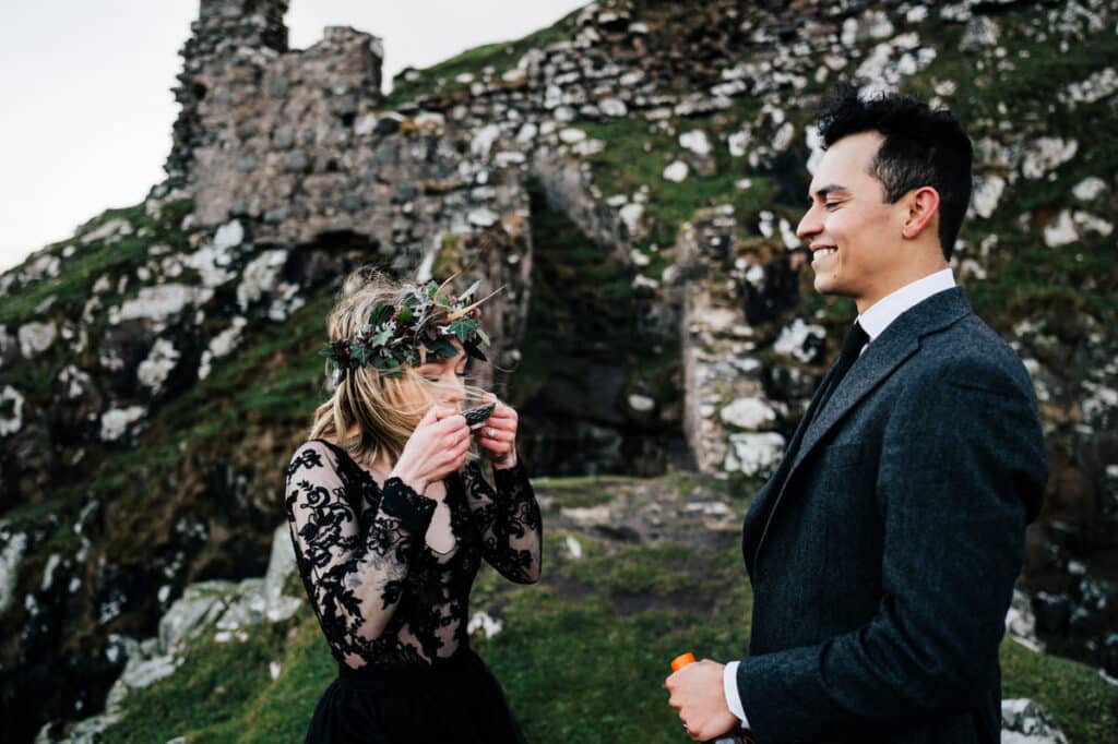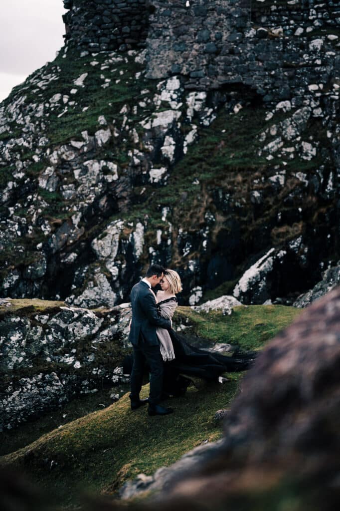 We headed off to multiple locations across Skye, including the Quiraing and some castle ruins, where they had their ceremony and drank from the quaich (a Celtic tradition!). As we dodged squalls, we reveled in where we were and the beauty that storms can bring. Without the storms we face earlier in the day, we wouldn’t have been greeted with such a spectacular sunset! These two jumped over boggy creeks, scrambled up ruins, and embraced in the wind while the sun set at their backs.