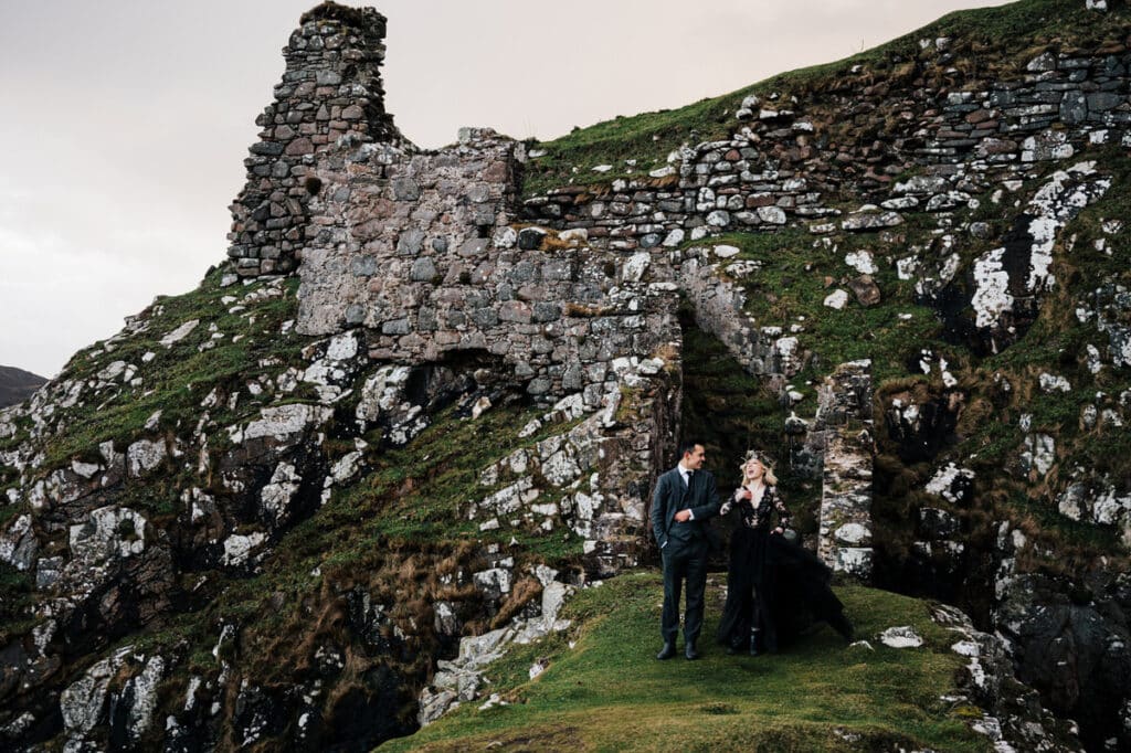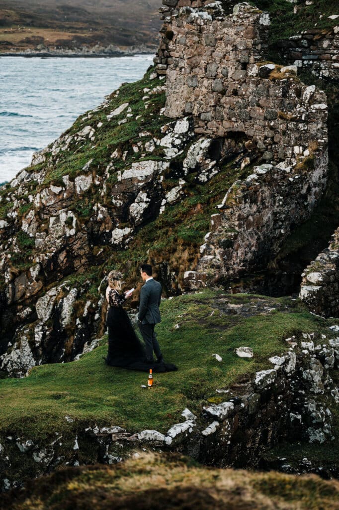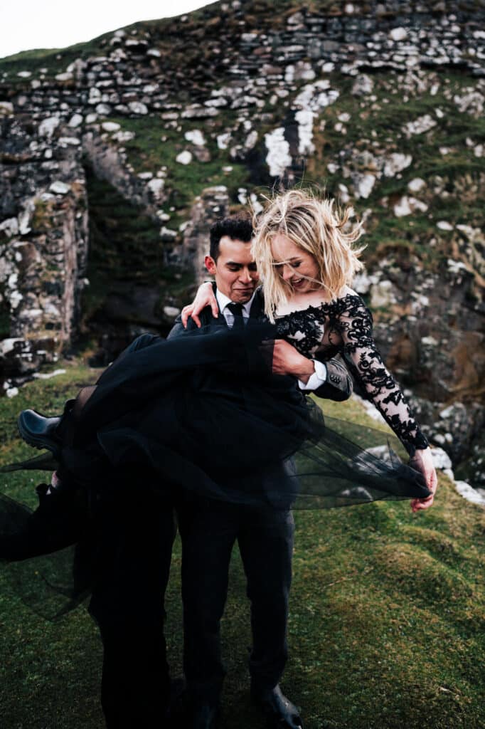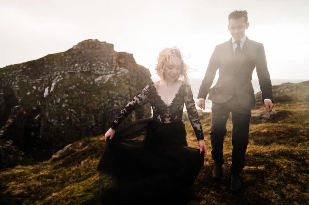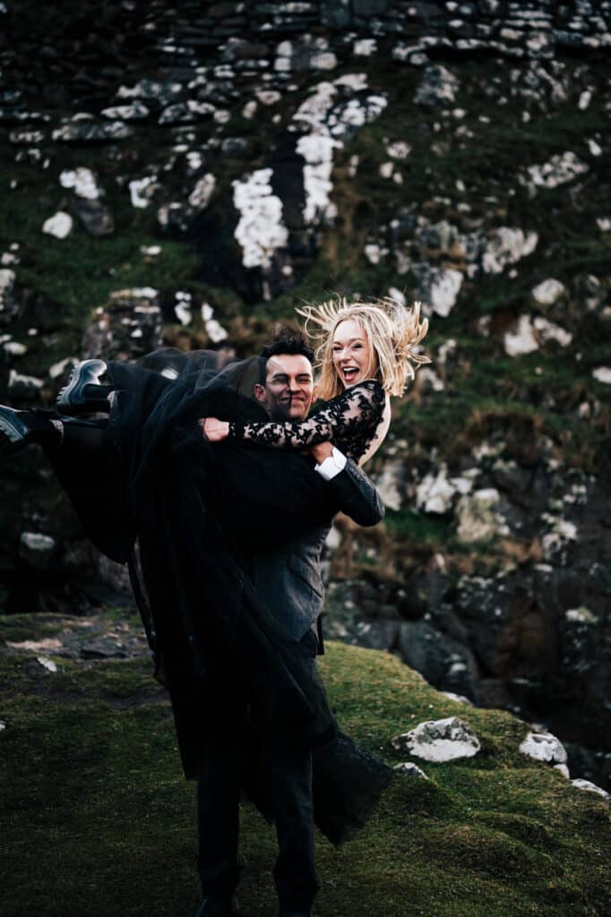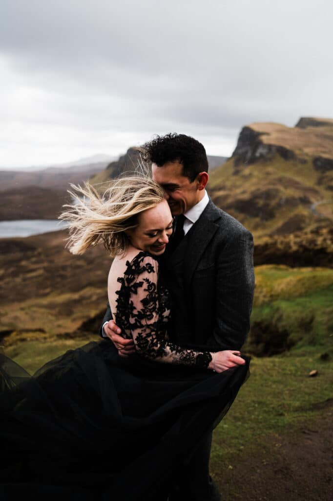 We headed off to multiple locations across Skye, including the Quiraing and some castle ruins, where they had their ceremony and drank from the quaich (a Celtic tradition!). As we dodged squalls, we reveled in where we were and the beauty that storms can bring. Without the storms we face earlier in the day, we wouldn’t have been greeted with such a spectacular sunset! These two jumped over boggy creeks, scrambled up ruins, and embraced in the wind while the sun set at their backs.